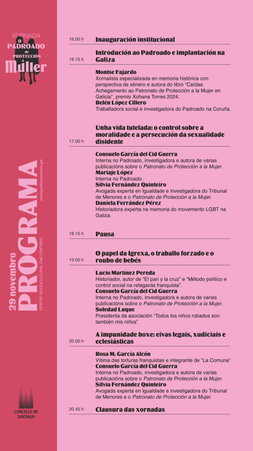 La concejala explicó que esta jornada se centrará en el ‘Patronato de protección a la mujer’, “una de las instituciones franquistas más desconocidas y menos divulgadas», que estuvo activa desde 1941 hasta 1985, y que «fue creada para ejercer control sobre las mujeres consideradas “descarriladas”, esto es, para ejercer control sobre la moralidad de las mujeres por lo que profundizar en el funcionamiento de este Patronato y en lo que supuso para nuestra sociedad es de suma importancia”. «En Galicia llegó a haber hasta una docena de instituciones de este tipo, donde las mujeres allí recluidas eran consideradas criaturas inmorales y las congregaciones religiosas que les hacían de carceleras como caritativas benefactoras», añadió.