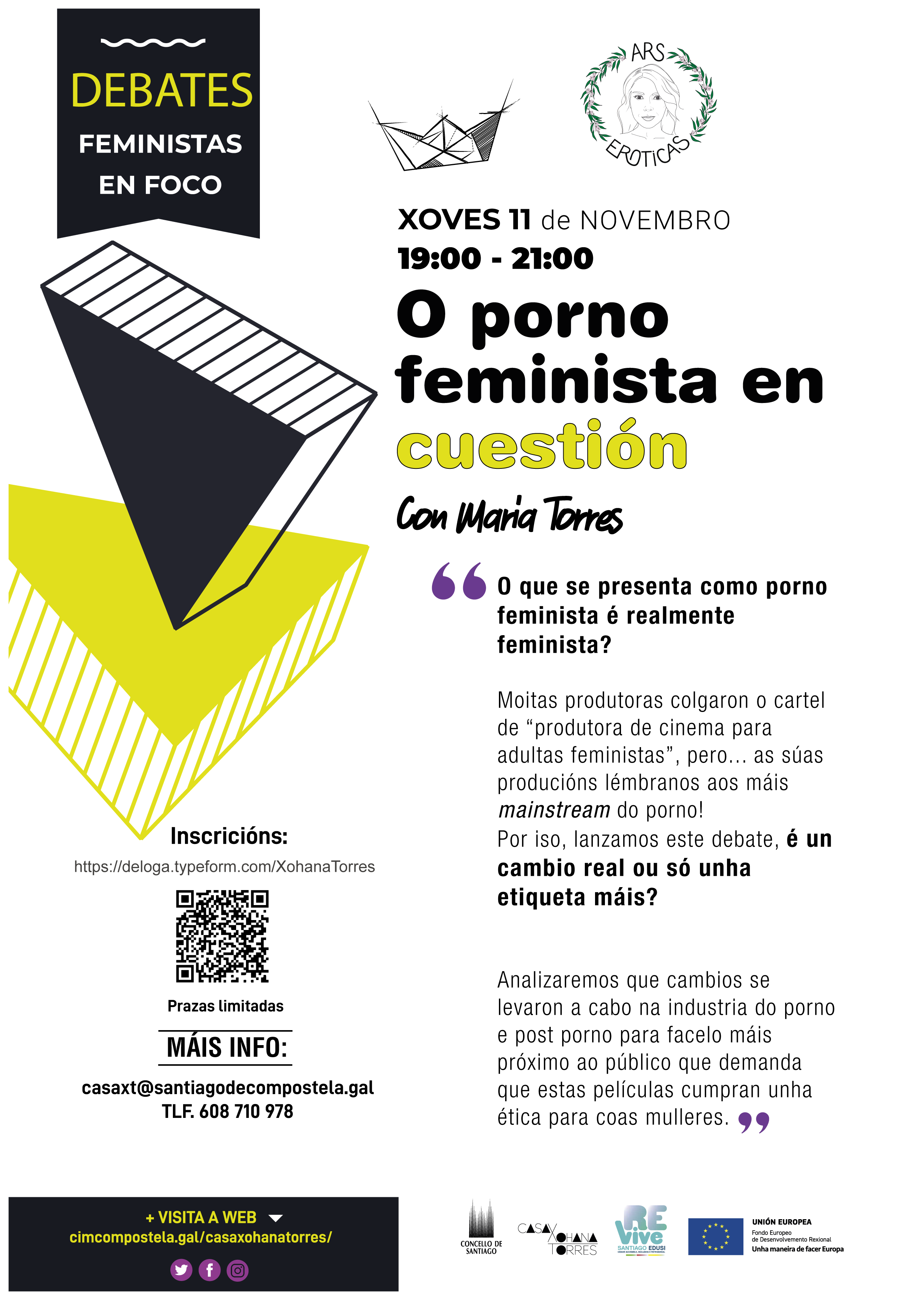 É o que se presenta como porno feminista realmente feminista? Ao longo do debate analizaremos que cambios se levaron a cabo na industria do porno e post-porno para facelo máis próximo ao público que demanda que estas películas cumpran unha ética para/coas mulleres. Moitas produtoras colgaron o cartel de produtoras de cinema para adultas feministas, pero ao ver as súas producións lémbranos ao máis mainstream do porno. Por iso, lanzamos este debate, é un cambio real ou só unha etiqueta máis?