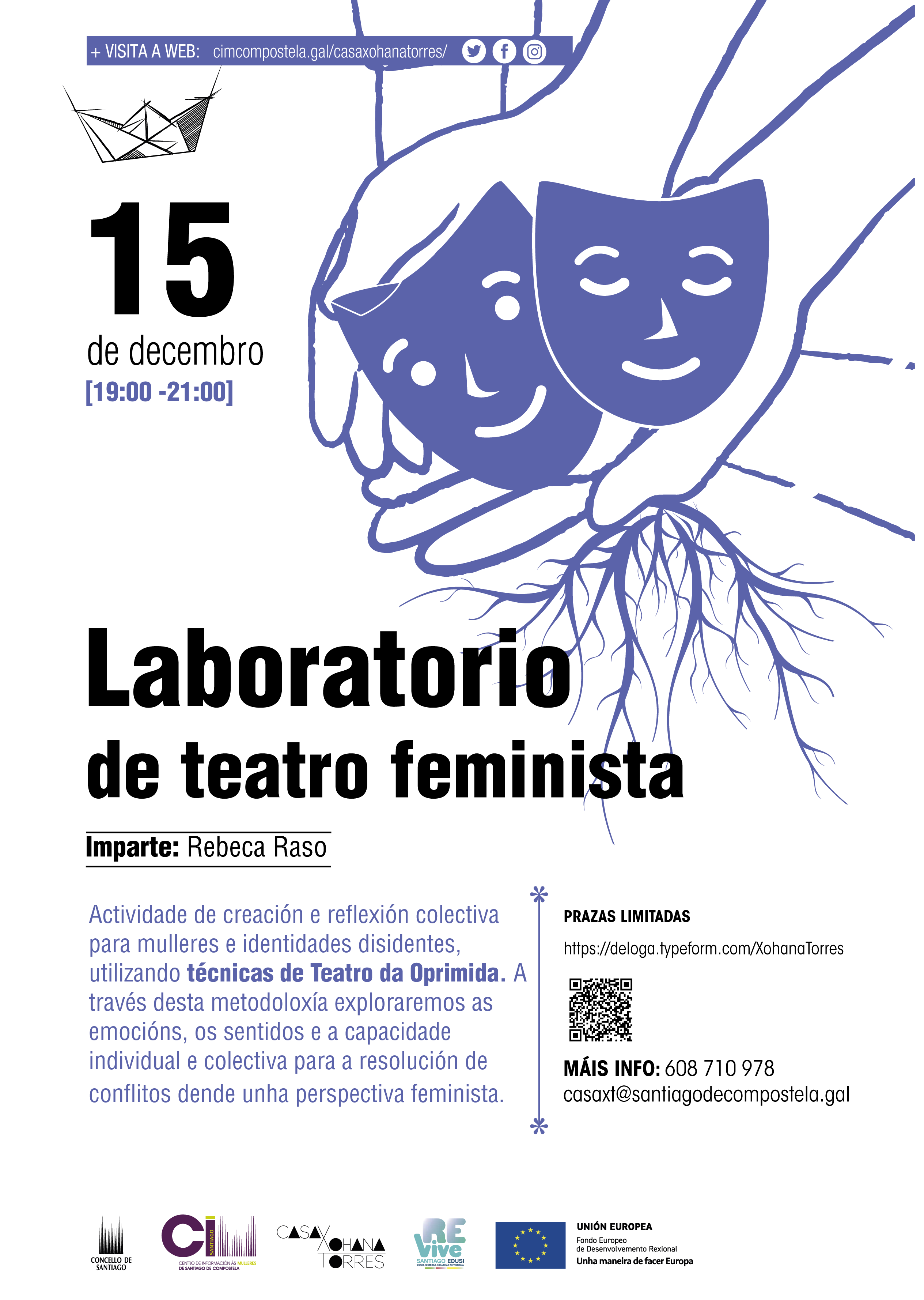 Obradoiro de creación e reflexión colectiva para mulleres e identidades disidentes, utilizando técnicas de Teatro da Oprimida. A través desta metodoloxía exploraremos as emocións, os sentidos e a capacidade individual e colectiva para a resolución de conflitos dende unha perspectiva feminista.